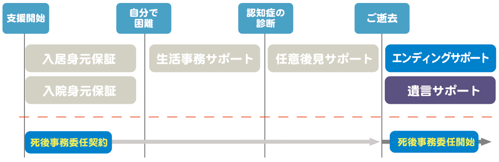 今後のお客様のご生活において、ご入居・入院の身元保証から意思能力の低下時に必要なサポート、ご逝去以降に至るまでトータルサポートいたします。