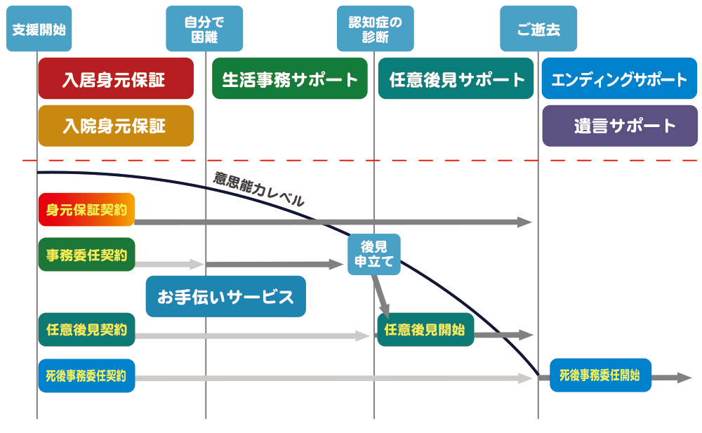 下記は時間を横軸、意思能力レベルを縦軸にとり生涯に必要な契約を時系列で表した図となります。入院、入居、認知症、ご逝去、これらに対して事前に契約を結び、対応いたします。